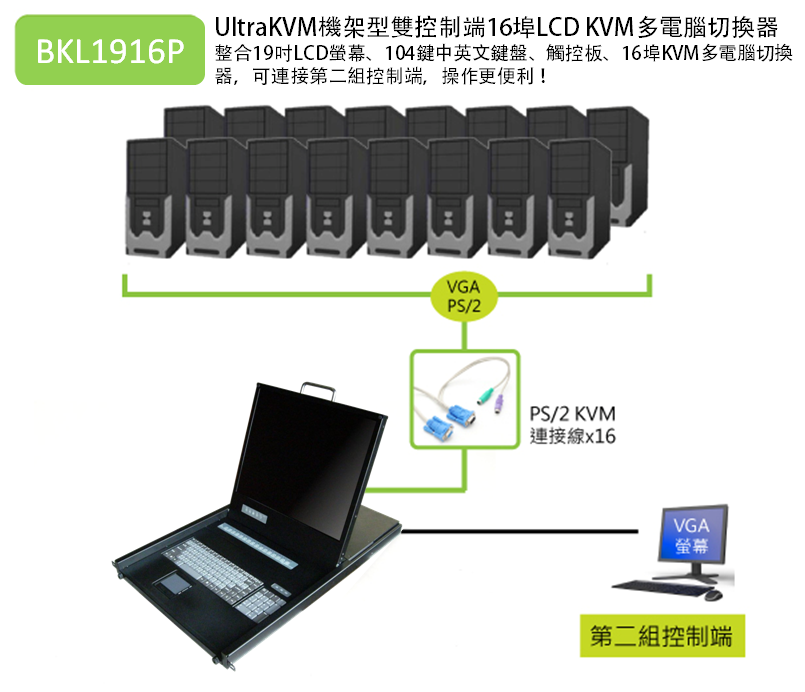 BENEVO推出一款抽拉式 1U TFT-LCD 16埠KVM 電腦切換器(BKL1916P),可以讓您更有效率的去管理控制機房中的電腦及伺服器。四合一機種在特製的 1U 高度滑軌抽屜中,整合了 19" TFT-LCD 螢幕、104 鍵中英文鍵盤、觸控板,以及 16 埠的智慧型 ( OSD ) KVM 多電腦切換器,可安裝於標準 19 吋機櫃。