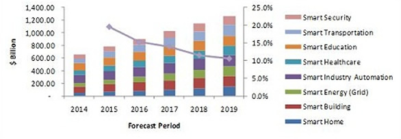 據市場調研公司《MarketsAndMarkets》近日發佈報告稱,全球智慧家庭市場規模將在2022年達到1220億美元,2016-2022年年均成長率預測為14%。智慧家庭產品分類涵蓋照明、安防、供暖、空調、娛樂、醫療看護、廚房用品等。